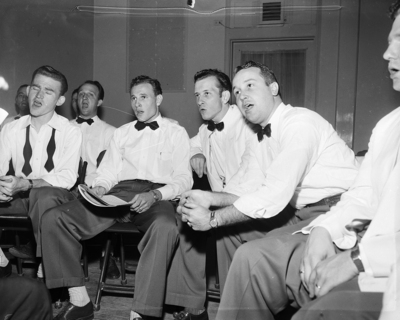Dale Boyles, Ray Butler and Clifford McCamey, left to right, all Dallas, Texas and Pacific Railway employees, get in the mood for the T&P Minstrels' Star-Telegram Milk and Ice Benefit at the Singersrehearsals which are going strong these days.
