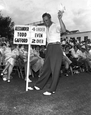 Steward (Skip) Alexander grins happily after finishing with his 66. He was particularly pleased with a par on 18, after having made a great long iron recovery shot. Published in Fort Worth Star-Telegram, morning edition May 26, 1950.