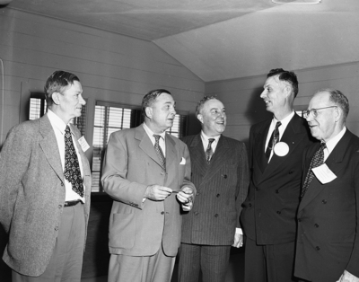 Oil men in Snyder told a group of visiting Fort Worth business men where it was found in Scurry County. From left to right, Ben P. Monning, Amarillo Lawyer and oil man; C. T. McLaughlin, Snyder oil man rancher; Russell Brown of Washington, general counsel for the independent Petroleum Association of America; W. W. Rice, Fort Worth Stockyards Company, and C. E. Buchner of Tulsa, IPAA executive manager. Published in Fort Worth Star-Telegram evening edition May 25, 1950.