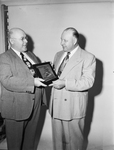 The South Side Lions Club named Walter Jetton of 3316 West Biddison to receive its first achievement award, a plaque which commended the grocer and caterer "for service to club and community". McLeod Greathouse, left, club president, made the presentation to Jetton. The club meets in the College Avenue Baptist Educational Building. Published in Fort Worth Star-Telegram evening edition, May 31, 1950.