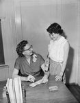 Miss Maurice Northcut, teacher in South Hi Mount Elementary School, shares an interest with Jo Marie Hill, sixth grader who is a depositor in the school Savings System. Miss Northcut's own account, started during her childhood, has remained open through the years she has encouraged others to be thriftily. Published in Fort Worth Star-Telegram evening edition, May 30, 1950.