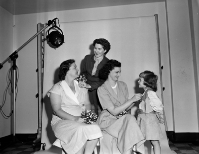 All set for the annual poppy sale here by American Legion Auxiliaries and the Bothwell Kane Post are three officers of the South Side Unit. Mrs. C. C. Williams, chaplain and unit sale chairman, pins a poppy on Mrs. Bennye Morgan, (wife of J. F. Morgan Jr.) left, unit president, while Mrs. Jean Sloan, (wife of Harlan Sloan), vice president, pins one on her daughter, Gayle Jean. Published in Fort Worth Star-Telegram morning edition, May 27, 1950