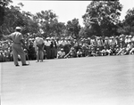Ben Hogan sinks putt on the 4th hole at Colonial Country Club, Fort Worth, National Invitation Golf Tournament; golfer on left is Johnny Palmer.