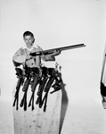It couldn't happen but it did, and it brought about a meeting of the judges. It was unprecedented. So the judges ruled it hadn't occurred. Although 11-year-old Hi Moreland had won both the sub junior and junior state trap shoot championships held recently in Houston, the judges told the Fort Worth youngster to take his choice. A boy holding a gun sitting on a stool with guns under him.