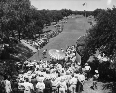 The size of the gallery following the Ben Hogan-Jimmy Demaret-Johnny Palmer threesome is shown by this view down the first fairway. That's Demaret preparing to slap his initial drive. Published in Fort Worth Star-Telegram, morning edition May 28, 1950.