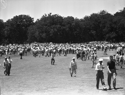 Several thousand fans make up a huge gallery at Colonial. They are following the Jimmy Demaret - Ben Hogan - Johnny Palmer threesome. Note that a few have given up on getting a close view and have started moving to next green. Published in Fort Worth Star-Telegram, morning edition May 28, 1950.