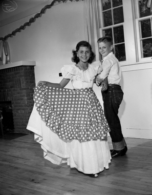 Honored recently by her parents, Mr. and Mrs. Stewart Chesser, 2211 Williams Place, was Elizabeth Chesser, pictured with Marcus Carter who is swinging his partner at her own square dance. Published in Fort Worth Star-Telegram morning edition, June 4, 1950. Two children in formal wear, smiling and locking arms.