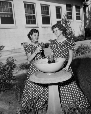 Serving cold drinks to a group of square dancers at the Woman's Club are Carolyn Cole, left, and Martha McBride, after a strenuous dance period. Two young girls wearing polka dot dresses with boil of ice and drinks on a table. Published in Fort Worth Star-Telegram morning edition, June 4, 1950.