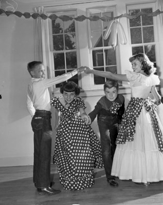 It's "dip and dive" for this quartet, left to right, Mike Carter, Deanna Gorbett, Michael Connelley, and Louella Baker, all dressed up for square dancing. Published in Fort Worth Star-Telegram morning edition, June 4, 1950. Four children in formal attire. Two boys and two girls.