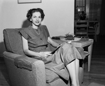 Mrs. Nell Itschner, 4262 Hampshire, will move to Chicago soon with her husband, Bernard Itschner. They will leave June 6. A woman sitting in a sofa chair smiling and wearing a dress. Published in Fort Worth Star-Telegram evening edition, June 9, 1950.