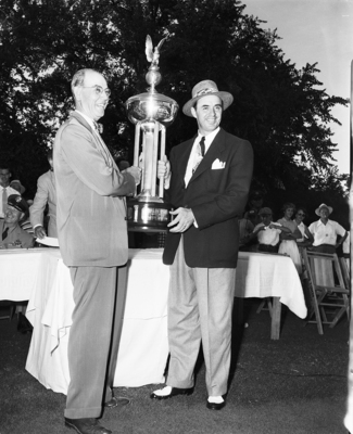 Sam Snead, right, accepts the Leonard Trophy from Marvin Leonard after he had won the Colonial National Invitation title. Published in Fort Worth Star-Telegram, evening edition May 29, 1950.