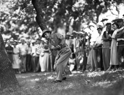 Sam Snead, left in trouble because of a straying tee shot, threads an iron through the tree trunks and onto the fairway at the fifth hole. Foliage deflected the shot, and left it short, but a long putt saved the par. Published in Fort Worth Star-Telegram, morning edition May 29, 1950.