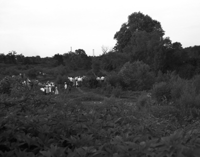 Crowd gathered along the river bank north of the W. 7th St. viaduct while the search was under way for Louis Lauro Lira, who disappeared during a swim in the Trinity Clear Fork. Published in Fort Worth Star-Telegram morning edition May 22, 1950.