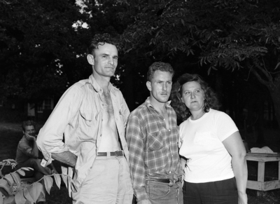 Gene Hollowell, left, and L. L. (Eddie) Edgar, center, look out over the portion of Lake Worth from which they saved the two survivors of the boating accident in which four persons drowned. With them is Mrs. Edgar. Published in Fort Worth Star-Telegram morning edition May 29, 1950.