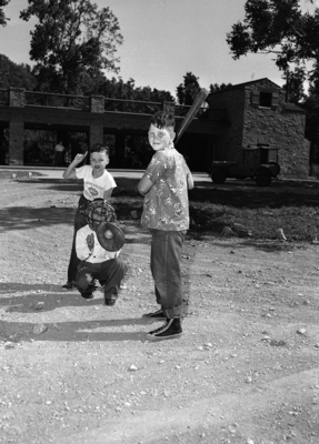 Umpire Randy Coleman, of 3060 Pecos, calls 'em fast on Jimmy Cosby, of 4201 Avenue J, batter, while Johnny Howard, of 2928 Fitzhugh, performs catcher's duty at a game at Amon Carter Young Men's Christian Association (YMCA) Camp near Lake Worth at an open house. Published in Fort Worth Star-Telegram morning edition May 29, 1950.