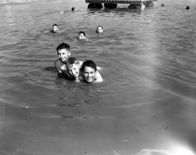 Enjoying a cool dip in the pool at the Amon Carter Young Men's Christian Association (YMCA) Camp at an open house were, left to right, Freddie Collins, 4900 El Campo, Willard Reynolds, 3540 Plymouth, and Jimmy Wood . Published in Fort Worth Star-Telegram morning edition May 29, 1950.