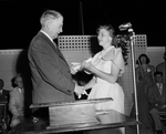 Anna Jackson, number one student in Masonic Home's graduating class, receives her diploma from W. Stephenson Cooke, president of the home's board at exercises on the campus. Published in Fort Worth Star-Telegram morning edition, May 29, 1950.