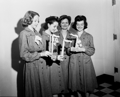These four members of Girl Scout Troop 13, their leader and 10 other troop mates hope the children of City-County Hospital have as much fun with the toys the troop has made as they had making them. In the group distributing the jumping jacks were, left to right, Mina Mae Holt, Frances Barclay, Mrs. W. S. Owen, leader, and Scotty Owen.