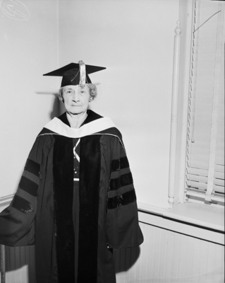 Mrs. Rose Lisenby. Published in Fort Worth Star-Telegram evening edition, May 29, 1950. A woman wearing a cap and gown.