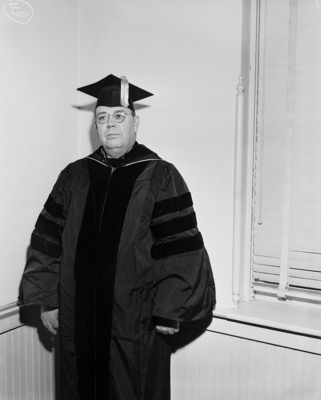 D. A. Hulcey. Man standing up wearing a cap and gown. Published in Fort Worth Star-Telegram evening edition, May 29, 1950.