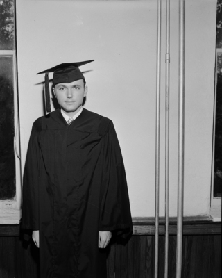 Clyde McClure, Fort Worth, winner of the W. F. Hamilton award of $25 for the highest grade index in the graduating class. Published in Fort Worth Star-Telegram morning edition, May 30, 1950. A man smiling wearing a cap n gown.
