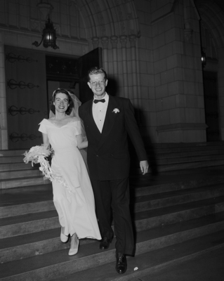 Mr. and Mrs. Henry Glenn McCleary leaving First Methodist Church their marriage. She is the former Miss Beryl Tenney Nowlin, daughter of Mr. and Mrs. Henry and Phyllis Bryant Nowlin, 2804 Travis. After the reception at the Woman's Club they left for a trip to Grand Lake, Colorado, after which they will go to Morton to live. Published in Fort Worth Star-Telegram evening edition, May 30, 1950. A man in a tuxedo and woman in a white wedding dress. The woman has flowers in her hand and holding the man's hand with the other.