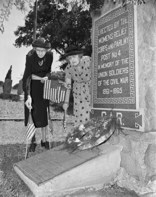 Mrs. Alice McEwen of 819 Samuels, secretary, left, and Mrs. Ola Rollins of 820 Samuels, chairman of the executive board of the Woman's Relief Corps of the Grand Army of the Republic Auxiliary, placed flags on the graves of six Union soldiers in Oakwood Cemetery. Published in Fort Worth Star-Telegram evening edition, May 30, 1950.