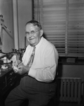Dr. William Oliver Talbot, 77, kept office hours as usual his selection by Texas dentists as the state's most representative dentist. Published in Fort Worth Star-Telegram morning edition, May 31, 1950. A man sitting down in formal clothes smiling and doing something on his desk.