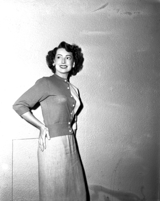 Pretty Johnnie Rankin models a Jantzen "convertible" sweater which buttons up both front and back. One side of the sweater can be buttoned on to another sweater in contrasting colors making two sweaters into four.