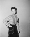 A Dorothy Korby blouse of checked cotton is accented with gold metallic threads, as shown here by Marie Hobbs. Published in Fort Worth Star-Telegram evening edition, June 1, 1950.