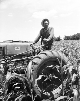 Image shows Conway Peterson on tractor in a corn field on Peterson farm. Published in the Fort Worth Star-Telegram morning edition, September 3, 1950.