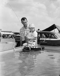 Also at the depot, Eddie Lee Guffey, 4, operates a toy tugboat by remote control. The technician is Robert Lake, who demonstrated how remote control is used in Army Signal Corps work. Eddie Lee is the son of Mr. and Mrs. Coy Guffey, 4159 Hemphill.