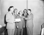 A. B. Thomas, right, presents civil service awards to Deward Gibson, Harold Kutschied and Charles Voight, left to right, at a conference of the Southern District, Auditor General, U. S. Air Force, at the Worth Hotel Monday. Colonel N. O. Wahlstrom, director of the district, is at extreme left.