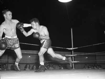 Buddy Garrison, left, scores with a left hook against Harold Bitler in their about at the Jacksboro Highway arena Garrison, representing Panther Boys Club, won a close decision over the slugging Bitler. Two boys throwing punches at each other. One boy is leaning out with his elbow pointed up fist is punching the other teen's boxers armpit.