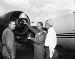 CAA Pilot Martin L. Sheppard inserts powder bomb in the nose of jet engine of his plane. Watching the unusual process are Technician Willis Gresham, left, and J. Howard DeCelles, chief of CAA's Fort Worth region flight inspection branch.