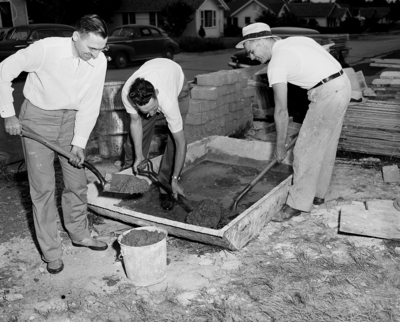 Elders John Kozel and Harold Jewkes, left and right, of the Seventh Day Adventists, help mix a little cement used for imbedding roof plate bolts in preparation for carpenters who will put a roof on the Goodwill House for Mrs. Ruth Vorhies at 915 Broadus. Center is Charles Campau, financial secretary for Carpenters Local 1822, who supervised the work.