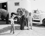 Bobbie Hines hands up some straw for one of the three elephants being used here as attention-getters for the Pioneer Days Celebration and Rodeo, opening Saturday on the North Side.