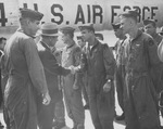 Amon Carter Jr. shaking hands with the crew of the last of the B-36 bombers, Carswell Air Force Base