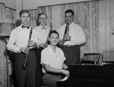 Jack West, who will be presented in a piano recital, will be assisted by, left to right, Edward Breeding, James Dunn and Dwight West, clarinetists. Jack, at piano, and Dwight are brothers. All are Paschal High School students. Published in Fort Worth Star-Telegram morning edition June 4, 1950.