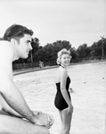 Opening Swim Day- The city's seven municipal swimming pools opened Saturday. Here, Bill Rence of 704 E. Powell watches Betty Jo Moore, 17, of 3421 Hamilton drive, take her fist dip of the season at the Forest Park pool.