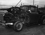 Image of a truck, heavily damaged from a wreck. Roy Alvin Willborn was killed and Robert McDade was critically injured when this truck collided with a heavy refrigerator tractor-trailer. Both men were carpenters. Published in Fort Worth Star-Telegram evening edition June 2, 1950.