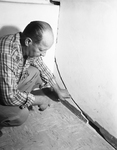 Reaching to the next class- C.J. Clark, president of the White settlement School Board, sticks his hand in a crack in two-inch lath and plaster wall between a first floor classroom and the band room.