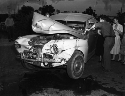 Spectators are shown examining the car in which Mrs. Mary T. (Molly) Summers, 79, died. A collision threw her against the gear shift lever, which was driven into her throat and suffocated her. Published in Fort Worth Star-Telegram evening edition June 2, 1950.