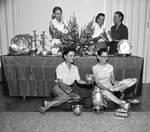 Committee members admire silver which will be awarded Friday as prizes. Seated left is, Mrs. Leo O' Dell, seated right, Mrs. Paul W. Morgan. Arranging flowers is Mrs. Jess L. Steward, left, with Mrs. I. T. Murphy, center, and Mrs. C. C. Miller.