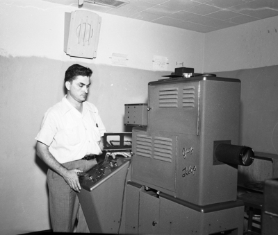 This big gadget is part of the $15,000 worth of the newest television equipment which was installed in the WBAP-TV studios. Called a "Telp" and manned here by Rupert Bogan, control room supervisor, the machine projects pictures, script or type into a TV transmitter, fading one image out while bringing in or superimposing one on the other. Watch for a new, professional touch to TV announcements. Published in Fort Worth Star-Telegram evening edition June 8, 1950.