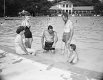 Parents and teenager interested in the Red Cross's new family swimming course, believed to be the first of its kind ever offered, get a few pointers from Dick Gallagher, who dreamed up the class. Left to right are Mrs. W. H. McShan, her daughter Janice, Gallagher, G.F. Farmer, and his son Jimmy.