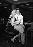 Dagmar (left), finds paternal affection in the editorial department during a recent visit. The person to her right is C.L. Richhart, senior reporter.