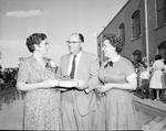 At pool dedication - Mrs. Evelyn Hardin, Left, receives a gift for her efforts in the building of a swimming pool at the Pythian Home in Weatherford. Presenting it are H. F. Horstmann, home superintendent, and his wife, assistant superintendent.