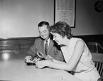 Gunston Hall commerative stamp. Assistant Postmaster James E. Warren and Mary Terrell Hudson looking at new stamp.