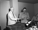 Major General Roger Ramey, right standing, smiling at a gift presented to him by Amon G. Carter.